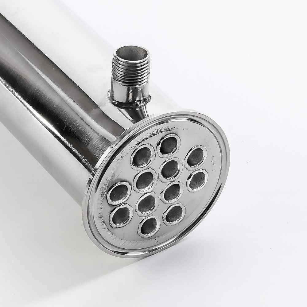 The boiler-type shell and tube cooler is made of food grade stainless steel, which guarantees the safety of use and durability. The design is a hollow pipe with a flange for clamping on one side, and a fitting for collecting the finished product on the other, 12 pipes (boiler) with an inner diameter of 10 mm and a length of 390 mm each are installed between them, the cavity around which is reliably isolated by two jumpers. Through a connected hose for supplying cooling to the fitting, cold water flows to the boiler tubes, effectively cools the alcohol-containing vapor passing through them, resulting in a condensed alcohol solution.