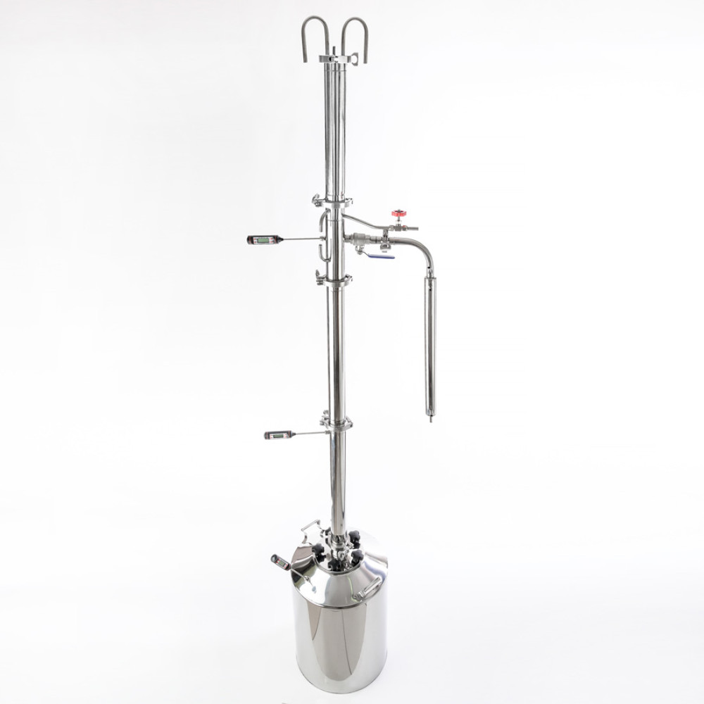 A 2-inch distillation column with a dimrot of 30/110/t should be bought by hospitable owners who regularly host guests and relatives at festive feasts. A distillation cube with a volume of 30 l provides for a single distillation a decent volume of alcohol with a strength of 96.6%, purified from any impurities. Most importantly, you don’t need to be a home brewing guru, to be a specialist in heat engineering and to understand all the subtleties of physical processes inside a column. It is enough to adjust the heating rate of the distillation cube and the rate of water supply to the dimrot.
